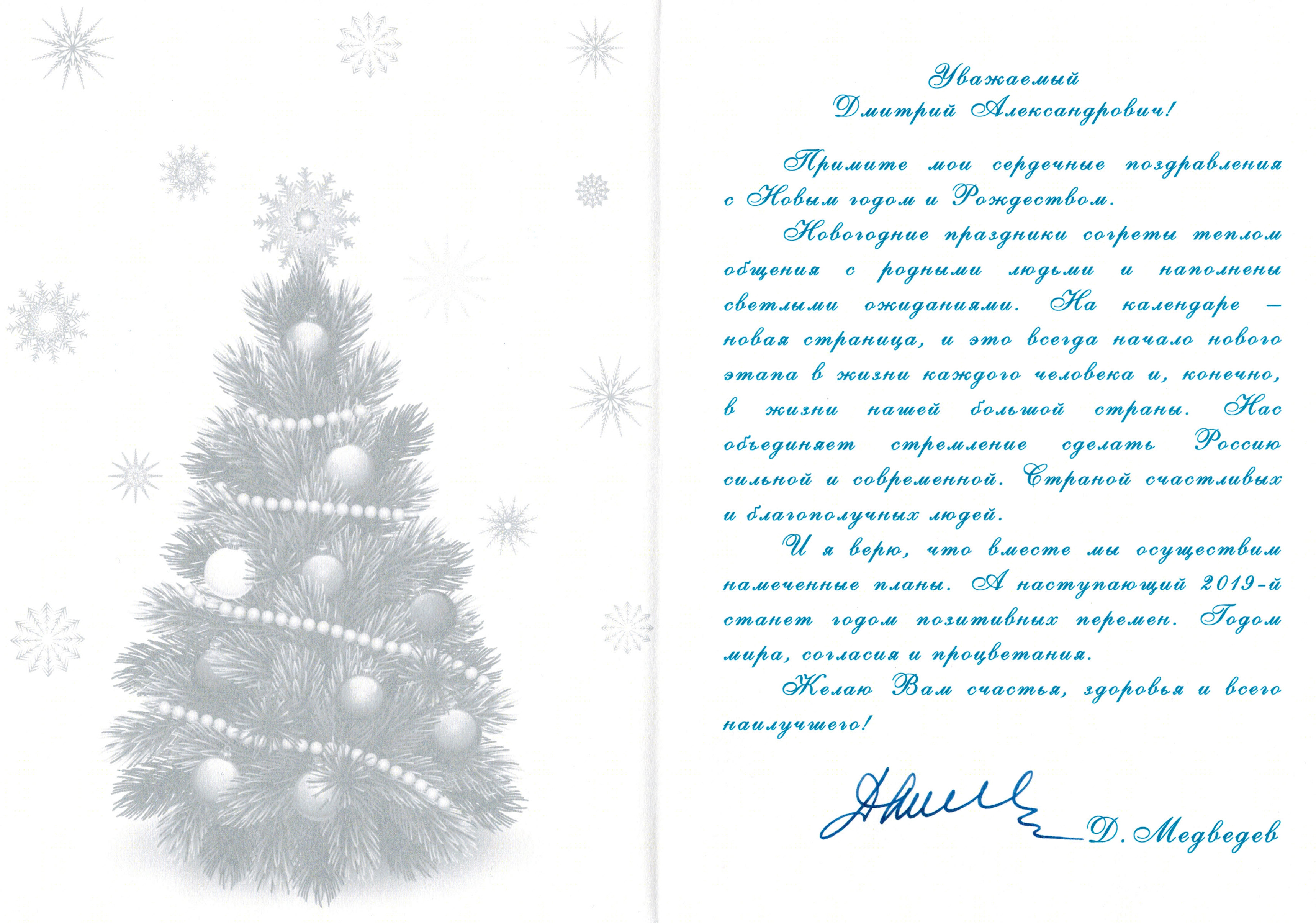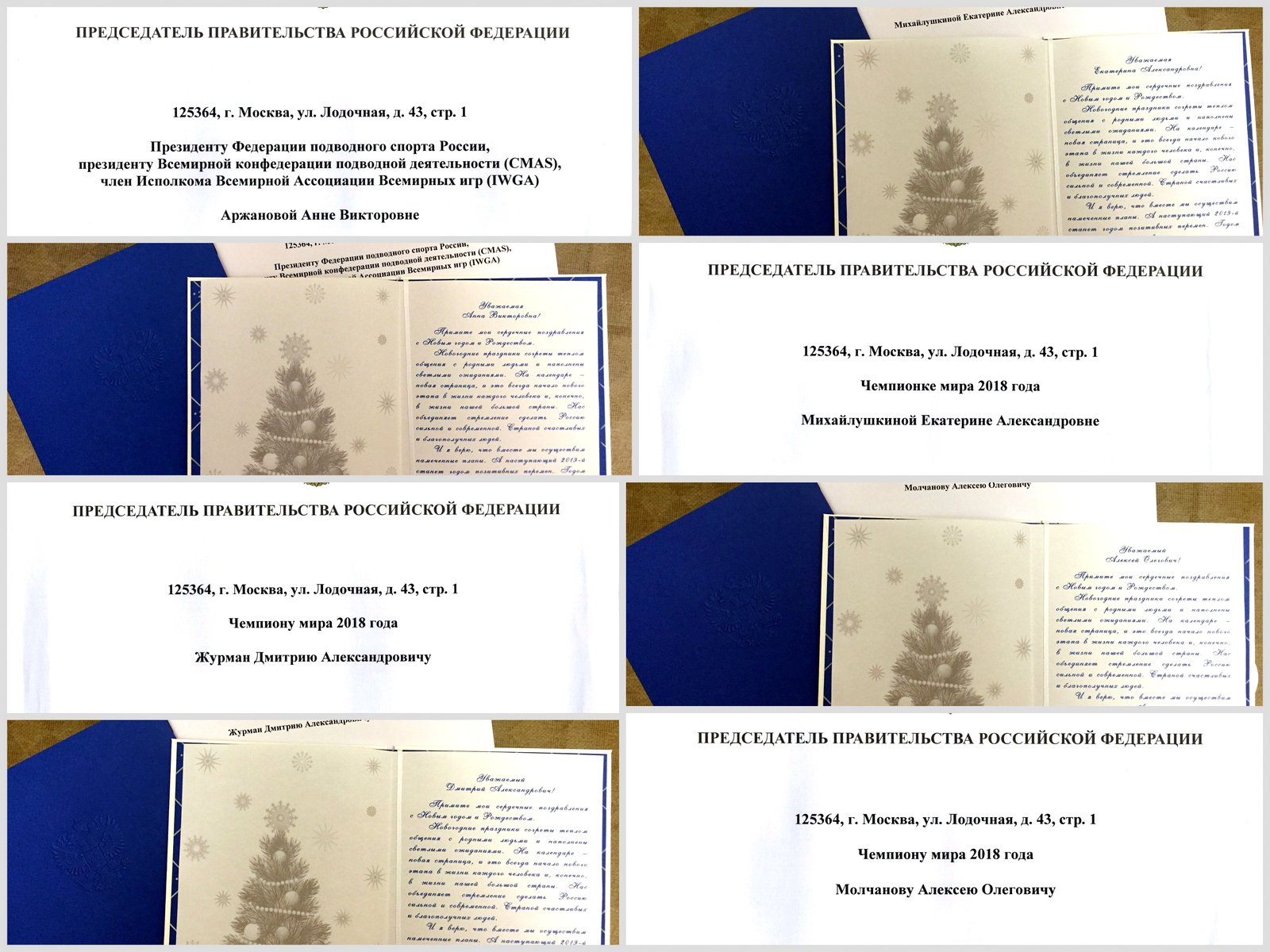 Председатель Правительства Российской Федерации Дмитрий Медведев направил в адрес Федерации подводного спорта России именные поздравления с наступающим Новым годом и Рождеством Президенту ФПСР Анне Аржановой и сильнейшим спортсменам-подводникам, чемпионам мира - 2018 года, Дмитрию Журману (Томская область), Екатерине Михайлушкиной (Ярославская область) и Алексею Молчанову (Москва).